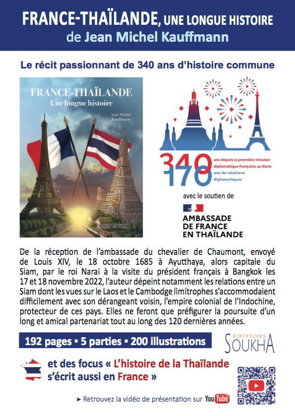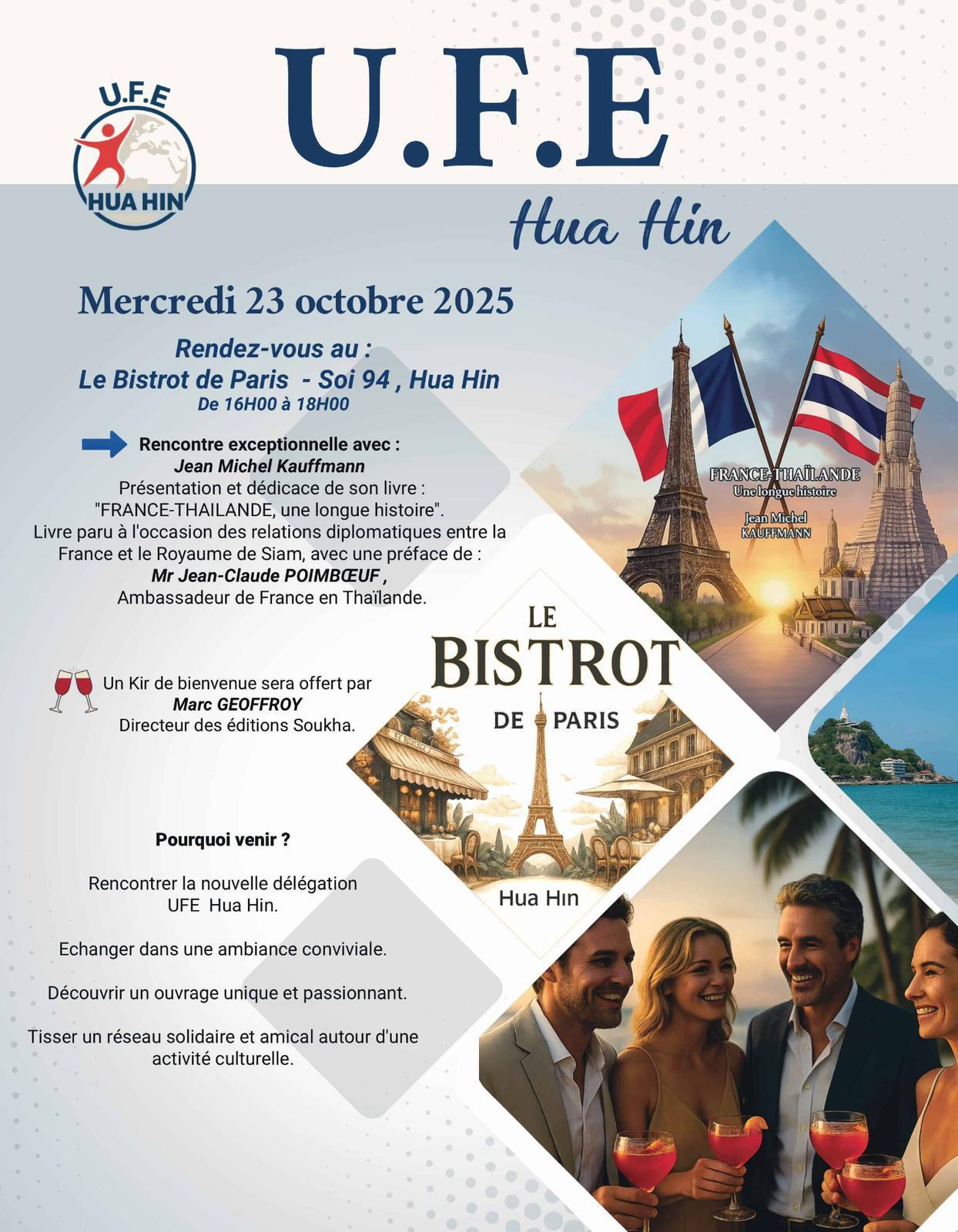 Mercredi 23 octobre 2025 au Bistrot de Paris (soi 94 à Hua Hin), de 16h à 18h, double rencontre tout d’abord avec Jean-Michel Kauffmann qui présentera et dédicacera son livre « FRANCE-THAÏLANDE – Une longue histoire », livre paru à l’occasion de la célébration des 340 ans de relations diplomatiques entre la France et la Thaïlande. Rencontre également avec la nouvelle délégation de l’UFE Hua Hin, antenne locale de l’Union des Français de l’Etranger, animée par Anne-Marie Toudic, ancienne consule honoraire et à l’origine de la création de l’agence consulaire de Hua Hin.